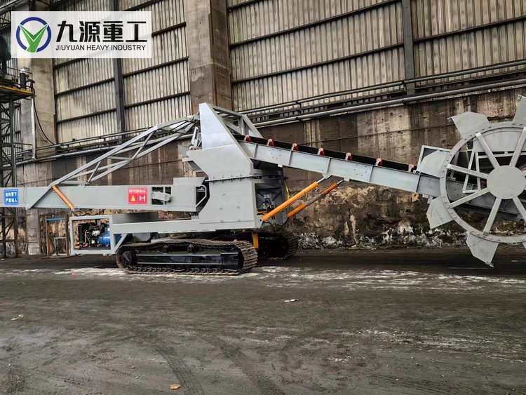 履帶式斗輪機是指一種用于大型干散貨堆場的既能堆料又能取料的連續(xù)輸送的高效裝卸機械。由可俯仰和水平擺動的膠帶輸送臂及其前端的斗輪、機架、運行機構(gòu)組成,膠帶可雙向運行,取料時由斗輪取料經(jīng)輸送臂送出,堆料時則由主輸送機運來的貨物經(jīng)由輸送臂投向堆場。